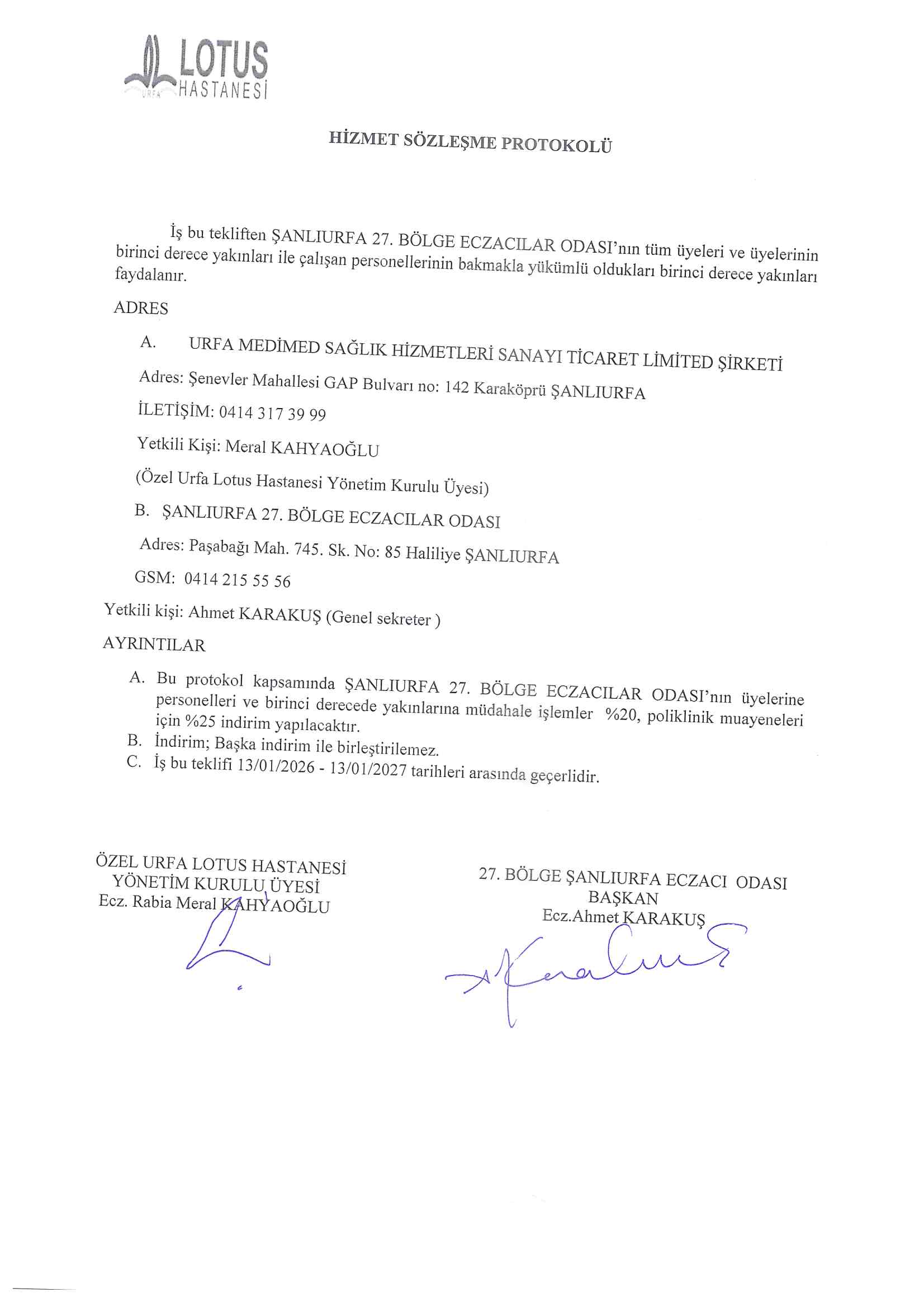 ÖZEL URFA LOTUS HASTANESİ İLE PROTOKOLÜ HK.